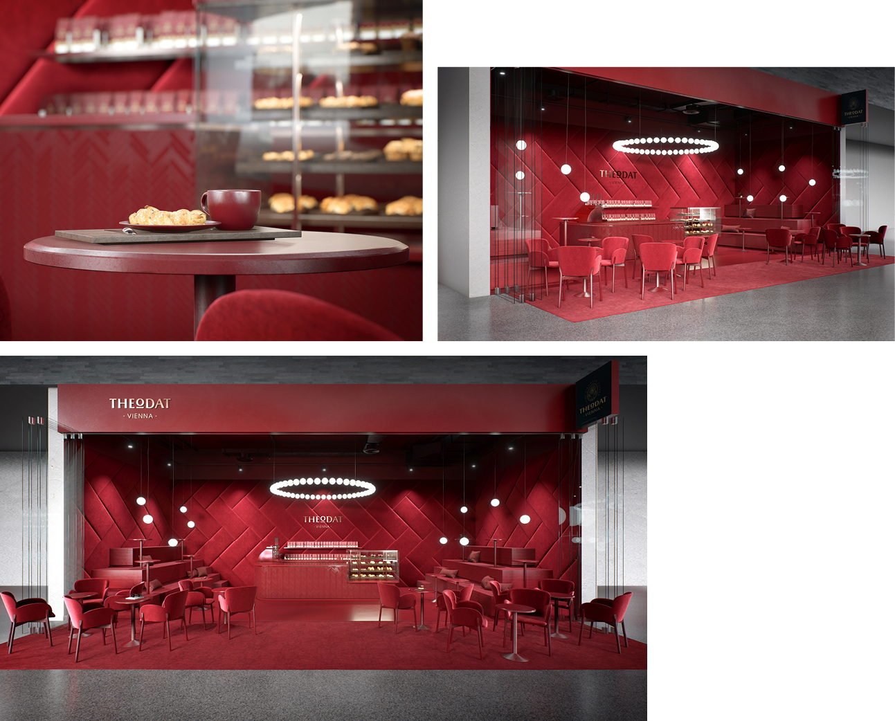 Our design reflects a reinterpretation of the Viennese coffee house. Dominant color concepts of red or petrol blue invite guests to stay. The arrangement of the shops optimizes guest service.